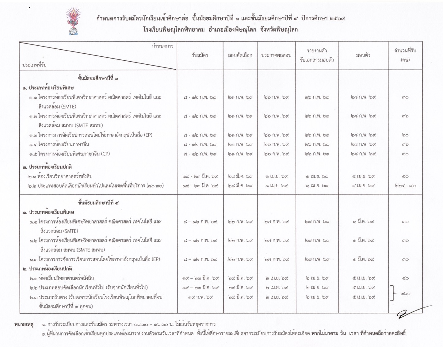 การรับสมัครนักเรียนเข้าศึกษาต่อโรงเรียนพิษณุโลกพิทยาคม 2569